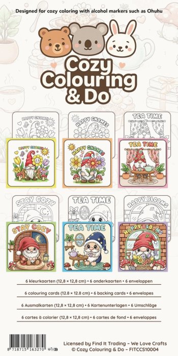 Belangrijkste kenmerken • Complete creatieve kaartenset – Alles in één om kleurkaarten te maken • Happy Gnomes thema – Vrolijke kabouterillustraties om zelf in te kleuren • Inclusief enveloppen – Kaarten direct klaar om te versturen of cadeau te geven • Ontspannend & creatief – Ideaal voor rust, focus en creatief plezier • Voor kinderen & volwassenen – Geschikt voor alle leeftijden en niveaus Productomschrijving De Cozy Colouring & Do – Colouring Cards Set is een complete creatieve set voor het maken van handgekleurde kaarten. De set bevat 6 kleurkaarten (12,8 × 12,8 cm) met cozy illustraties, 6 onderkaarten, 6 enveloppen De illustraties zijn ontworpen om zelf in te kleuren en te personaliseren. De set biedt een fijne, schermvrije creatieve activiteit die helpt ontspannen en de focus verbetert. Geschikt voor een rustig moment alleen, samen knutselen met kinderen of als creatieve pauze tussendoor. Dankzij de bijgeleverde enveloppen zijn de kaarten direct klaar om te versturen of cadeau te geven. Perfect voor een persoonlijke groet, een lief bericht of een creatief cadeautje. Cozy Colouring & Do staat voor warmte, creativiteit en ontspanning – eenvoudig, toegankelijk en leuk voor iedereen. -