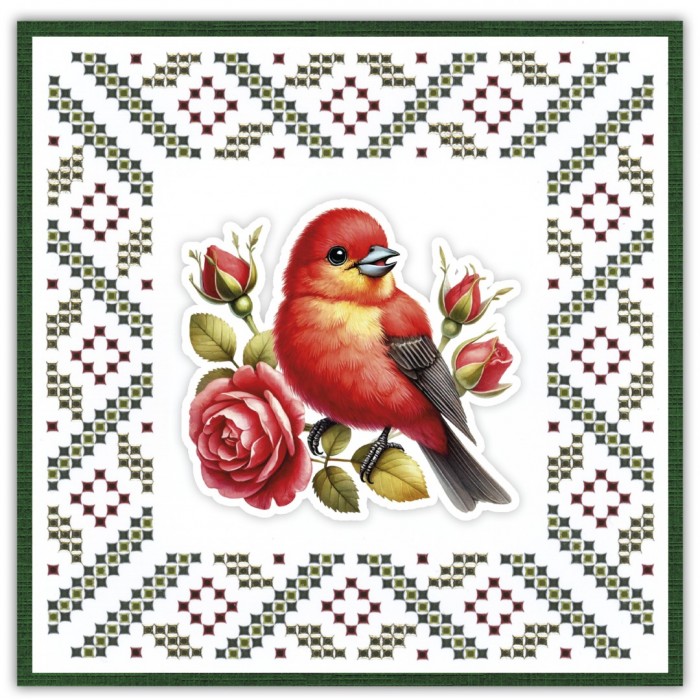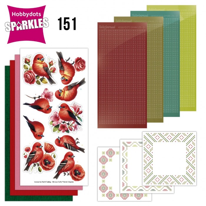 Deze set met Hobbydots-Sparkles bevat alle materialen voor 3 vierkante kaarten. De inhoud bestaat uit vier Sparkles stickervellen, drie 3D-afbeeldingen, drie witte oplegkaarten met bijpassende patronen en drie vellen kaartkarton. Het patroon is in kleur voorgedrukt op de oplegkaarten, waardoor je de stickers, zonder een Led Board te gebruiken, direct hierop kunt plakken.
