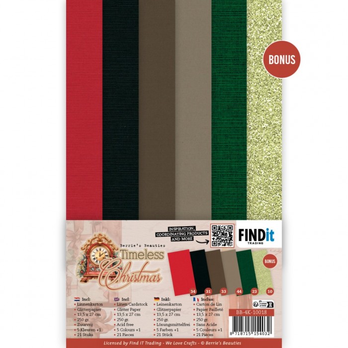Linnenkarton pakket, passend bij de collectie Timeless Christmas . 20 vel + 1 bonus, 21 x 29.7 cm, 240 grams. Pakket bevat 5 kleuren x 4 vel: 23 kerstgroen, 31 zwart, 33 chocoladebruin, 34 kerstrood, 44 mokka, bonus: 10 Glitter Gold.